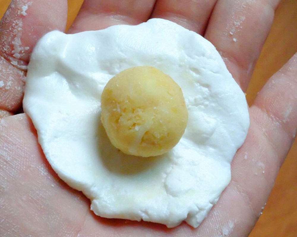 – Bao bột lại rồi vê tròn cho kín viên đường. Vê bột cho thật khít, tránh để không khí vào, tuy nhiên các bạn cũng lưu ý không nên vê quá kĩ, bánh có thể bị vỡ khi đun.