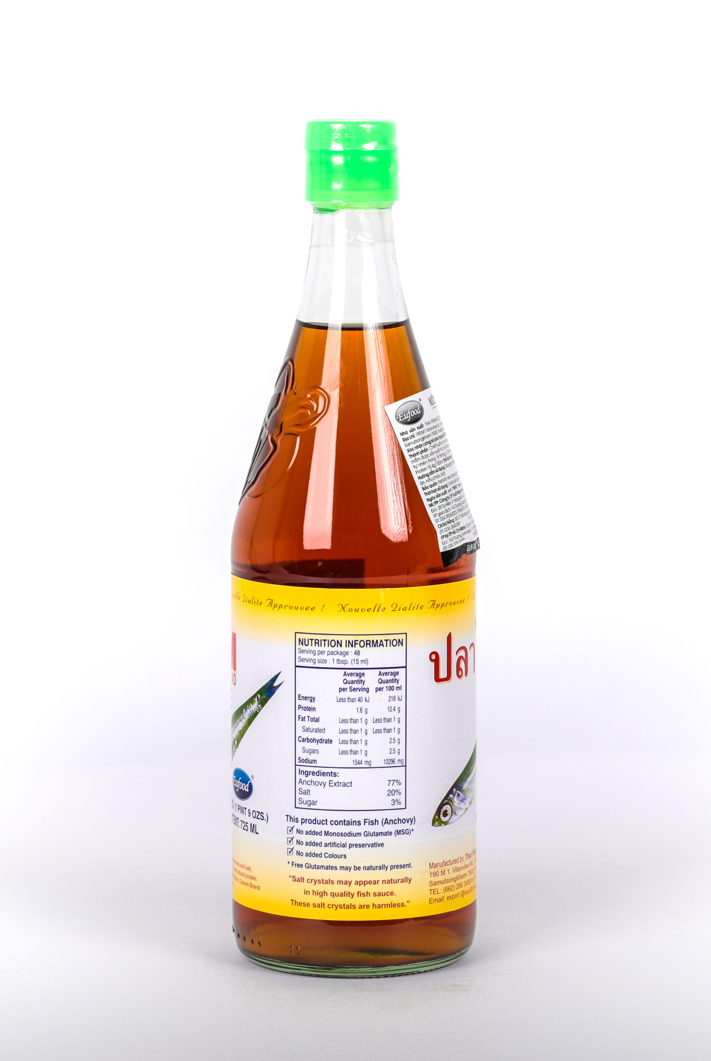 Thành phần: Chiết xuất cá Anchovy 77%, muối 20%, đường 3% (Nước mắm được sản xuất từ cá Anchovy tươi bằng phương pháp lên men tự nhiên trong 18 tháng).